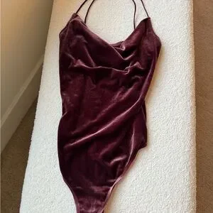 Elegant burgundy velvet bodysuit with thin straps. Perfect for a night out.