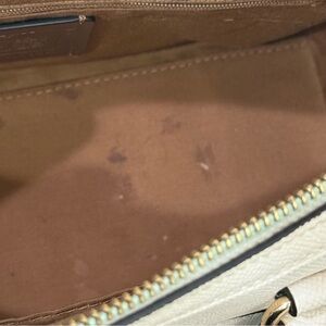 COACH 79946 Rowan Crossgrain Leather Satchel Shoulder Crossbody Bag Chalk / Gold. Pre-owned with normal wear from use. There are DISCOLORATION on the middle upper and sides at the back (barely noticeable but it’s there). Inner lining has few STAINS as shown. Bottom feet is slightly TARNISHED from sitting, overall still in great shape! Zoom in photos for details, flaws and measurements. You will get exactly as pictured!