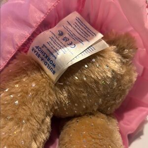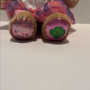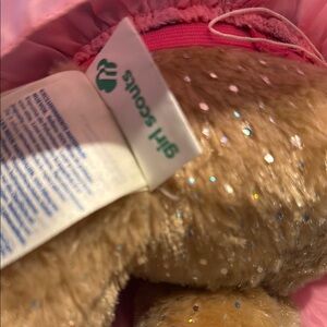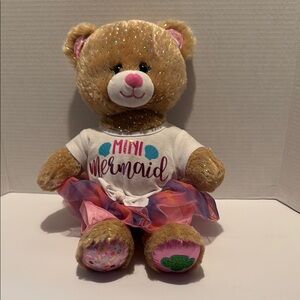 This Build-A-Bear stuffed animal features a mermaid-themed outfit, complete with a pink tutu-style skirt and a white Mini Mermaid t-shirt. Its soft brown fur and pink nose add to its cuddly appeal. This is the Girl Scout Trefoil Bear in the mini mermaid outfit. Pre owned in very good condition. Please see all photos.