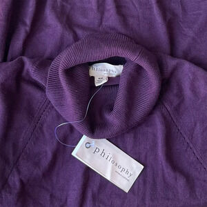 This Philosophy women's pullover sweater is a size medium and features a turtleneck design in a rich purple color. Made from high-quality, soft knit material, it offers a tight-knit style with short sleeves, making it ideal for casual fall occasions. The fit is regular, providing comfort and style for everyday wear. New with tags.