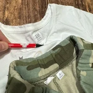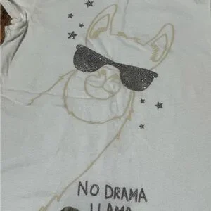 White llama graphic t-shirt with 'No Drama Llama' text. Green camo shorts with GAP logo.