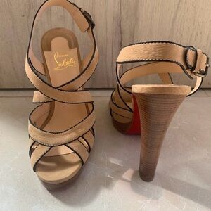 Christian Louboutin 120mm. Pumps open toe sandals color beige with cut out detailing. Barely worn in a very good condition!! Comes with two dust bags! Elevate your style with these Christian Louboutin tan strapy heels. Perfect for any occasion, these sandals offer both elegance and comfort. Love them but they are a size too small for me. Send an offer or I am open to trades depending on the item:)