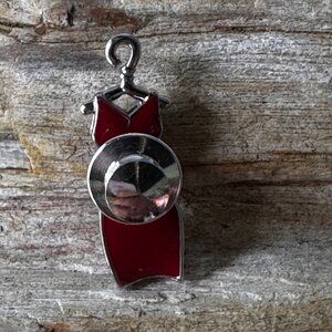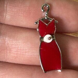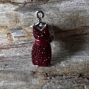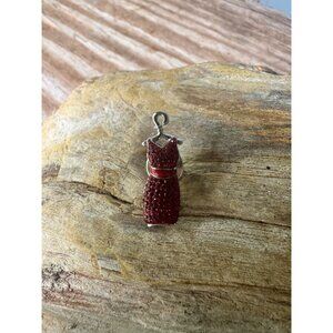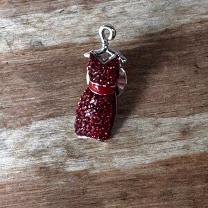 This vintage Swarovski pin features an elegant red dress design, fully adorned with brilliant red crystals set on a silver-tone base. Measuring 1.25", this pin is a perfect statement accessory that adds a pop of color and sparkle to any outfit.