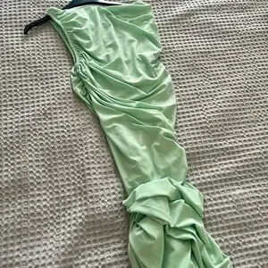 Elegant and versatile Diana dress by Norma Kamali in beautiful sea foam green. Excellent condition. Worn only a handful of times. Built-in bodysuit and generous ruching makes for a shapely and comfortable fit. Travels well and does not require dry cleaning.