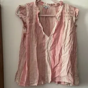 This stylish women's top features a charming pink and white striped pattern. Perfect for casual outings or a day at the office, it offers a comfortable fit with a touch of elegance.