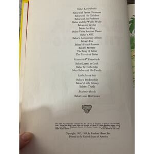 1963 Babar and his family follows the elephants as they build a magnificent city: Celesteville. Life is peaceful and contented, everyone has a job to do, and celebrations are frequent. But one fateful day a snake bites the Old Lady and Babar fears that he may lose his oldest friend. Illus. in full color by the author