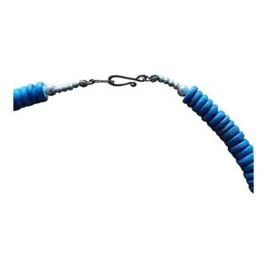 Vivid blue floral necklace with white accents, perfect for adding a pop of color to any outfit. Flowers are made of leather, beading and leaves are carved balsa wood.