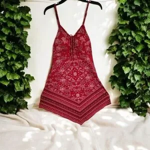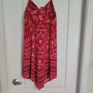 Turn heads and radiate effortless charm in this red bandana print dress with a unique handkerchief hemline. Featuring adjustable spaghetti straps and a flattering gathered front, this medium-size (7–9) dress is lightweight, flowy, and ready for sunshine.