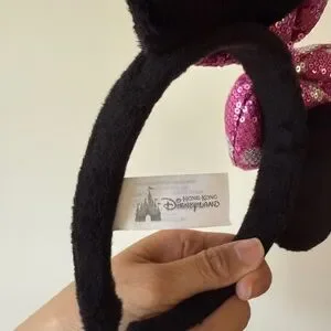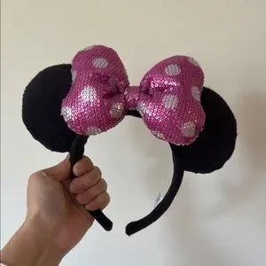 Black velvet ears with a sparkling pink sequin bow. Perfect for Disney fans.