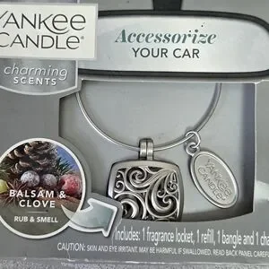 Enhance your car's ambiance with the Yankee Candle silver accessory. Infused with the refreshing scent of Balsam & Clove, this charming piece adds a touch of elegance to your vehicle.