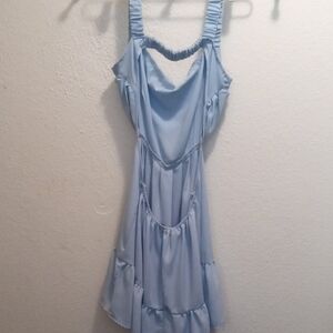 This sleeveless sundress from SHEIN features a stylish cowl neck and ruched detailing, ideal for a casual outing or a night out. The vibrant blue hue and ruffled hem add a playful touch, while the backless design enhances its breezy appeal.