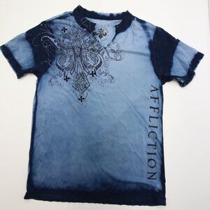 Affliction T-Shirt XL Blue Dye V Neck Ribbed Felt Detail Cross Cyber Goth Grunge