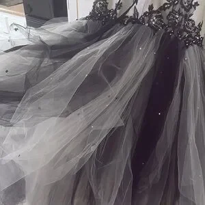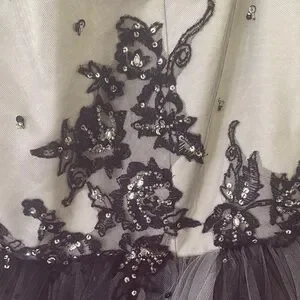 This elegant dress features a stunning black and white design, perfect for special occasions. The intricate detailing adds a touch of sophistication. You will be sure to WOW! Sooo many layers of beautiful white and black tool covered in shimmering sequins! There is a bit of make up on the inside near the bust. See pictures- not visible when worn! Size 9/10 original price $695