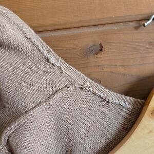 Beautiful long length cardigan blazer. Front pockets with a drapey front, no closures or clasps. There was a small repair made to the collar seam as shown but does not impact wear. Can be worn as is with the mend. Very soft, sturdy, beautiful piece.