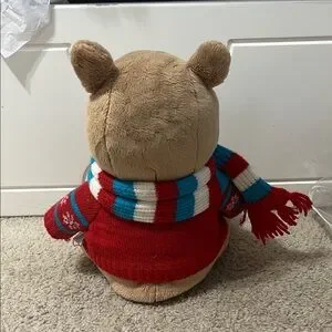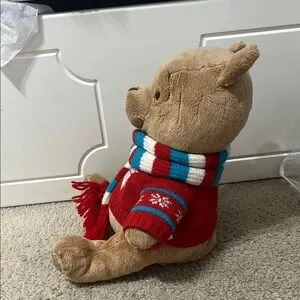 Adorable plush Winnie the Pooh wearing a red and blue scarf with a snowflake design. Perfect for cuddling or as a decorative piece. Disney store 2008. 14 inches.