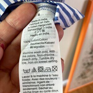 Crewcuts sundress, 100% cotton, perfect for vacation. I would say that this runs TTS. Oh and it has pockets! Hits at the knee.