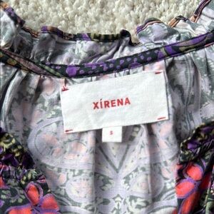 Vibrant women's top featuring a mix of coral, purple, and green patterns. Perfect for adding a pop of color to your wardrobe. The puff sleeves and little ruffle collar are the perfect touch!