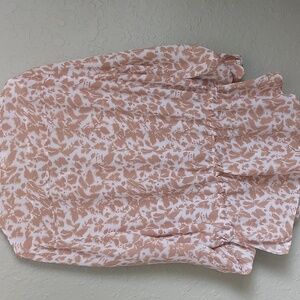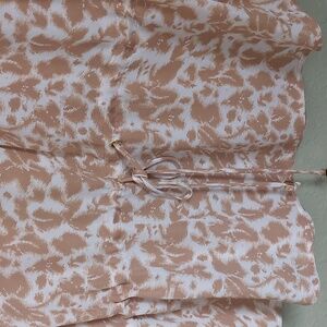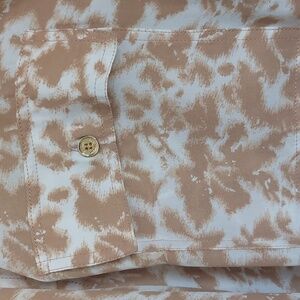 Very pretty Michael Kors blouse size 10 , 100% polyester ๐ This blouse is soft, pretty! buttons from the middle up has draw ties lower to make it bigger or smaller ๐ค it has long sleeves but buttons just below the elbow perfect ๐ no holes or tears ,stains , smoke free ๐ก