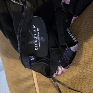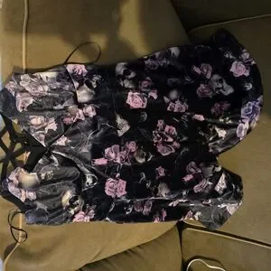 Black dress with pink floral and skull print. Unique and stylish design.