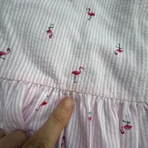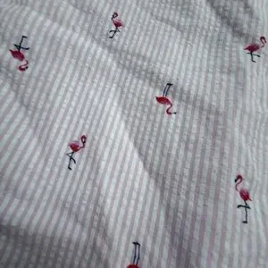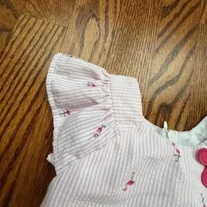 Play condition seersucker dress in a flamingo print with a flower appliqué on the shoulder and a ruffle hem. Tie back. Play for a spot near the ruffle on front, and some pilling.