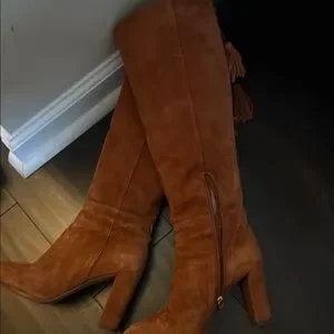 Step out in style with these elegant suede knee-high boots. The rich tan color adds a touch of sophistication to any outfit. Perfect for any occasion.