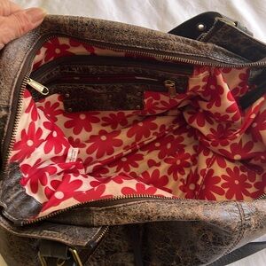 Stylish brown leather shoulder bag with a boho flair. Fun floral interior with multiple pockets. Zipper pocket and phone slot on exterior. Perfect condition. See last photos for dimensions.