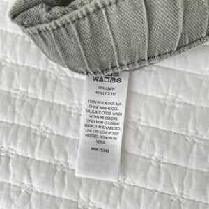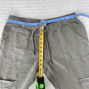 Features elastic waistband with drawstring ties, front side pockets, back pockets, side of leg pockets, jogger style / drawstring at bottom of leg, linen blend fabric. Measurements in images.