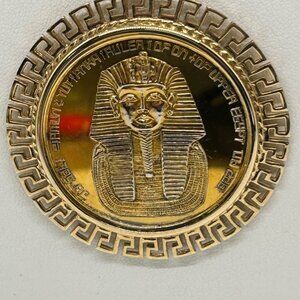 This gold-tone coin-style pendant beautifully showcases Tutankhamun's legacy through its intricate Egyptian symbols and a Greek key border, blending historical significance with timeless elegance.