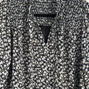 This elegant blouse by Pleione features a smocked design with a stylish tie front, perfect for versatile wear. The long sleeves and Mandarin collar add a touch of sophistication, while the white and blue color scheme ensures a fresh and modern look.