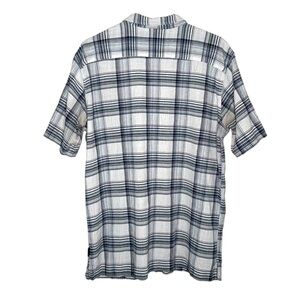 Patagonia organic cotton camp collar short sleeve button up shirt. Size mens XL. Great condition and quality. All over white and blue plaid colorway. Features front button up closure, chest pocket, side tag logo, and foldable collar.