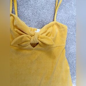 Cut from soft cotton-blend terry with a sunshine-yellow hue, Zimmermann’s Jeannie dress features a shoulder-bearing sweetheart neckline that frames a tied keyhole.