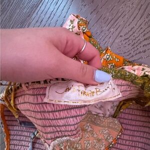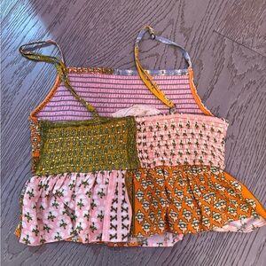 Vibrant patterned crop top with spaghetti straps. Features blue, orange, pink, and green patterns. Never worn