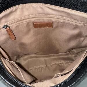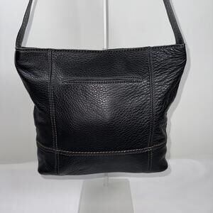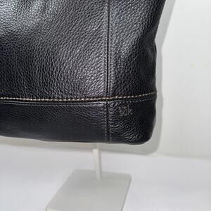 The Sak genuine black leather shoulder bag lined interior with soft tan fabric, multiple compartments and a secure zippered pocket, smoke free home, item as pictured, great condition. 9"w x 12"t x 3"d