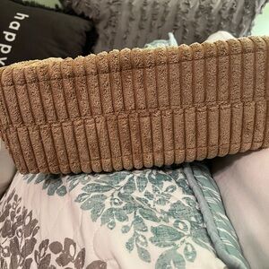 Stylish and versatile, this tan textured bag is perfect for any occasion. Its unique design adds a touch of elegance to your outfit. This bag is new, has never been used. Strap drop is 13”, measures 13” across, 10” top to bottom, bottom width is 5”. Smoke free home.