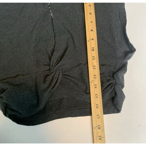 This is a pre-owned Free People Movement gray top, size L. It features a crew neck and short cap sleeves. The front has a twisted knot detail at the center. The material is 93% organic cotton and 7% elastane. The top measures approximately 18 inches across the chest and 19 inches in length. There are no visible stains or tears.