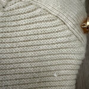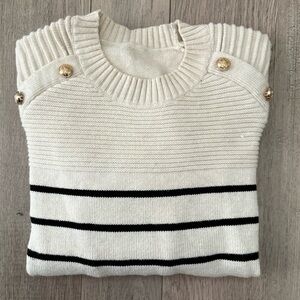 Stylish cream and black striped sweater with stylish button details. Perfect for a chic, casual look. Gently used in good condition, minor snag on right side. No size but fits like an XS.
