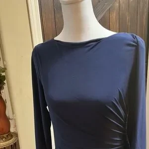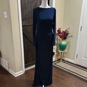 This elegant navy blue dress features a sophisticated design with long sleeves, perfect for any formal occasion. The rich color adds a touch of class to your wardrobe.
