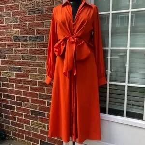 The fabric is cotton with elasticity and fits well on the figure. The belt can be tied both in front and behind and in any way since it is long enough. A thick amazing orange color - wow! There are buttons all the way, but the lower part is hidden under the panel. The sleeve style is Victorian, very voluminous at the bottom of the cuff, but the photos do not show this. My sister, with her size L, was not enough, so I marked the size as M, despite the fact that size 8 is indicated on the tag - see the measurement sheet. Designed with a notched collar and bishop sleeves, it offers a sophisticated yet.