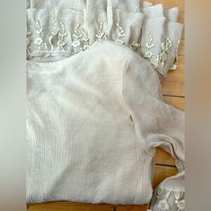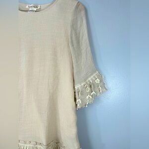 This is a bohemian style dress in cream with 3/4 sleeves. It features ruffled detailing at the hem and sleeves creating a layered look with lace and floral. It’s nude color & flowy lightweight material make it perfect for spring & summer!