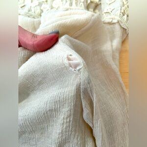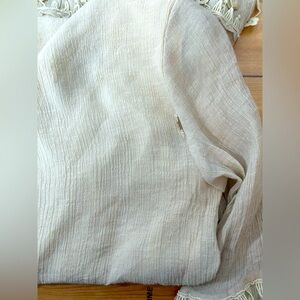 Pre owned- there is a small tear on top layer located on back left shoulder - I have not tried to repair with tacking or sewing - see photo