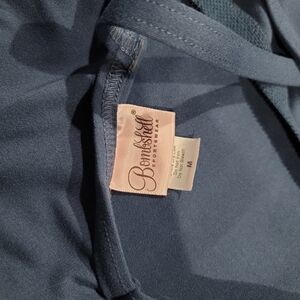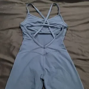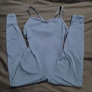 Size medium bombshell sportswear sculpted bodysuit in denim navy blue. Open strappy back with full length leggings, shelf bralette with pickets for padding (not inclided). No flaws or stains