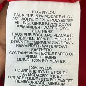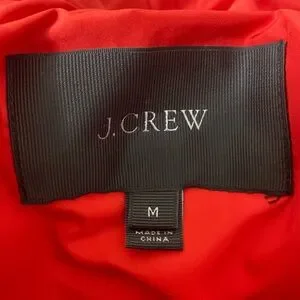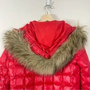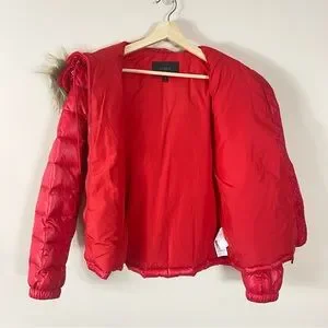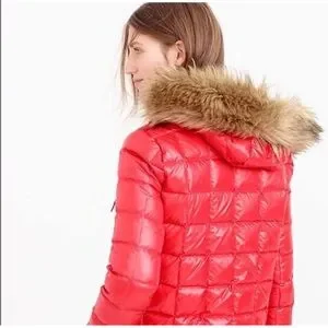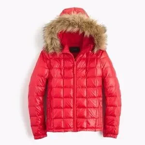 J. Crew Short Quilted Down Puffer Jacket with Faux Fur Trim Hood in Red - M