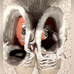 Step out in style with these Vans cordura high-top sneakers. Men’s 7.5/women’s 9. Decorative soft grey and white laces (hard to tell in pictures.)