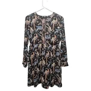 LOFT Womens 0 2 Petite Peacock Snow Bird Print Long Sleeve Dress Crew Neck
