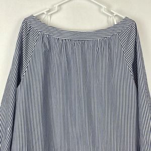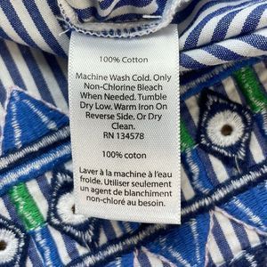 Stylish blue and white striped blouse. Features intricate blue pattern at hem. Perfect for casual wear.