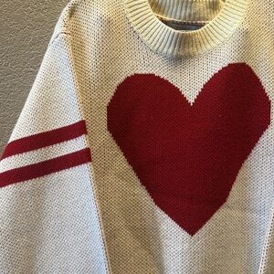This cozy sweater features a big heart design and long bell sleeves to keep you warm. Perfect for spreading joy and staying stylish with its round neckline. 100% acrylic material