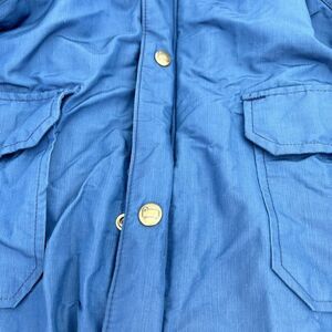 This vintage Woolrich field coat is perfect for the nature lover, and those who appreciate classic American workwear. Made in the USA, this 70s-90s era jacket has a solid blue pattern and is made with a cotton blend outer shell and wool flannel lining. The jacket has a full zip and snap closure, with a hood, pockets, and a blanket lined interior.