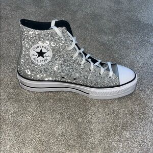 Dazzling silver high-top sneakers with iconic Converse style. Features white laces and black trim.