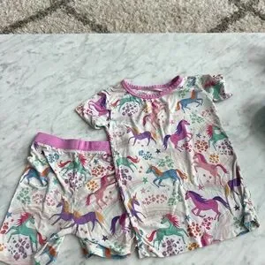 Adorable pajama set featuring a vibrant unicorn print. Includes a short-sleeve top and matching shorts. Perfect for a magical night's sleep.
