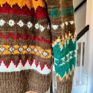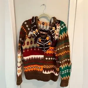 Cowichan style with small shawl collar, zipper front with oversized knit zipper pull